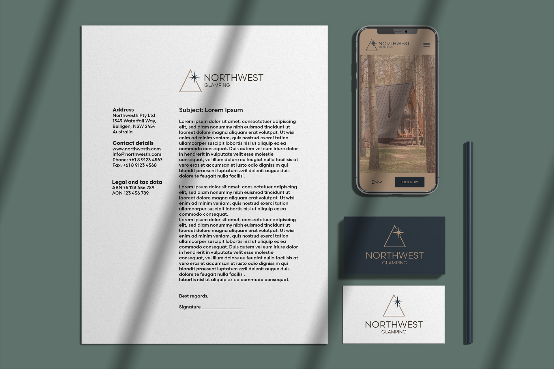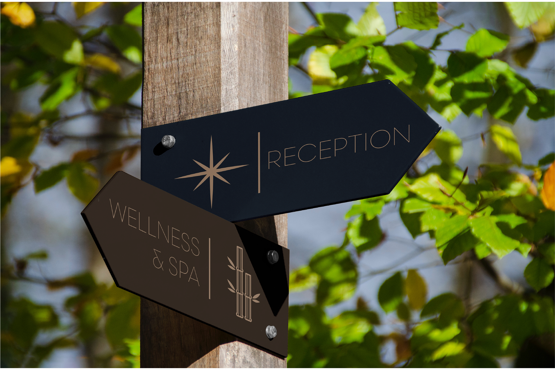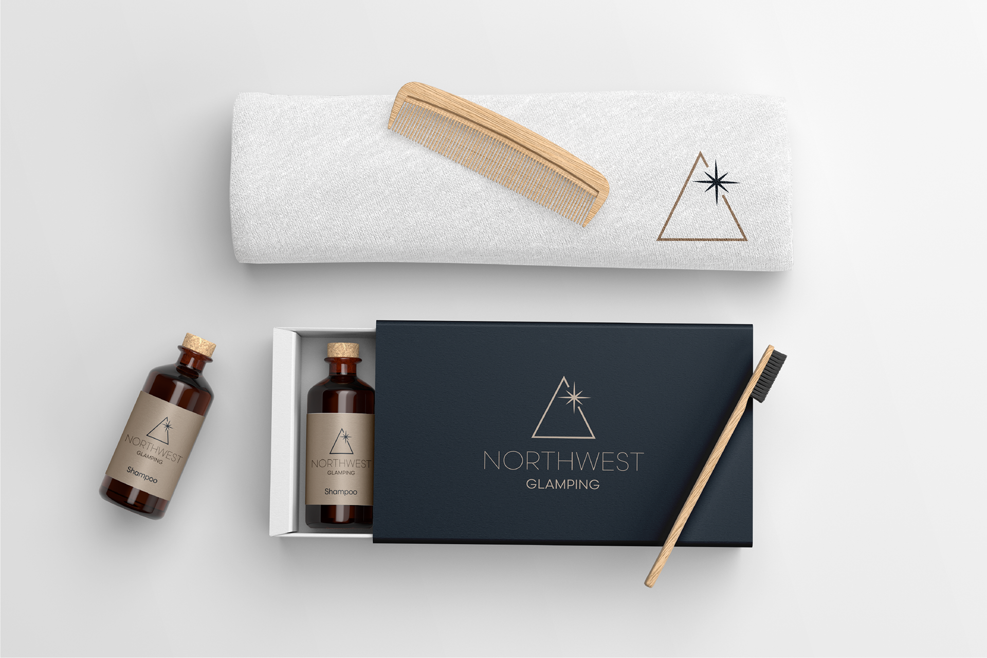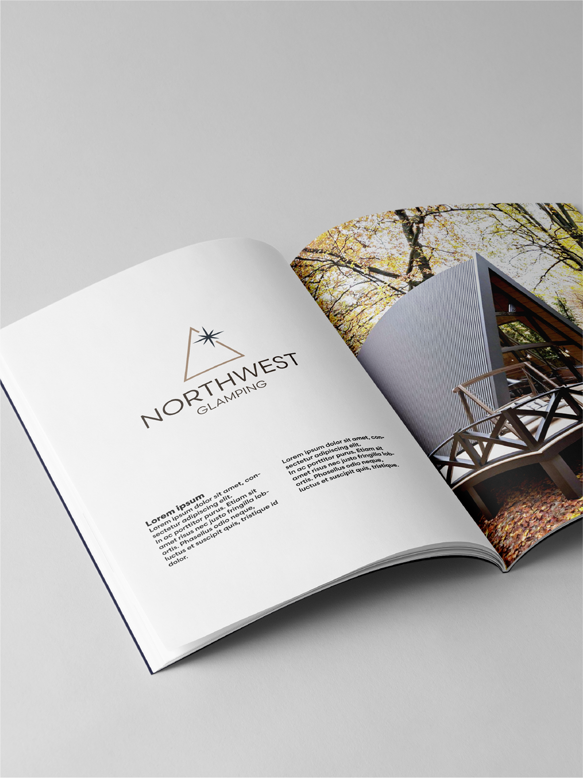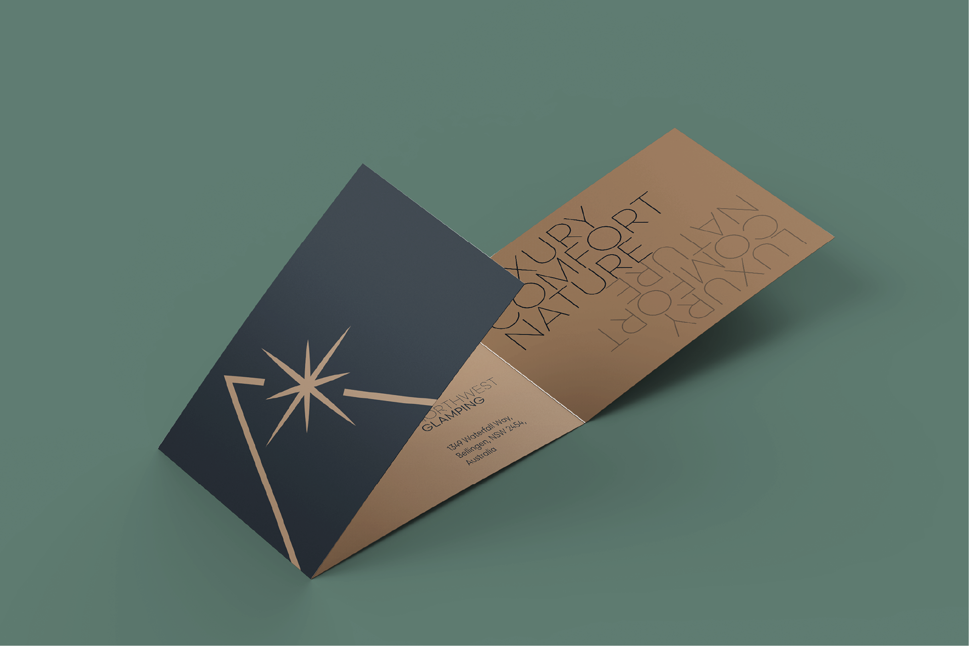 L’identità visiva nasce dall’incontro tra esplorazione e accoglienza. Il logo unisce la forma delle casette A-frame, simbolo di rifugio e natura, a una stella ispirata alla bussola, metafora di guida e scoperta. Le linee decise e la palette raffinata trasmettono un senso di modernità ed eleganza, riflettendo il carattere premium e avventuroso di Northwest.