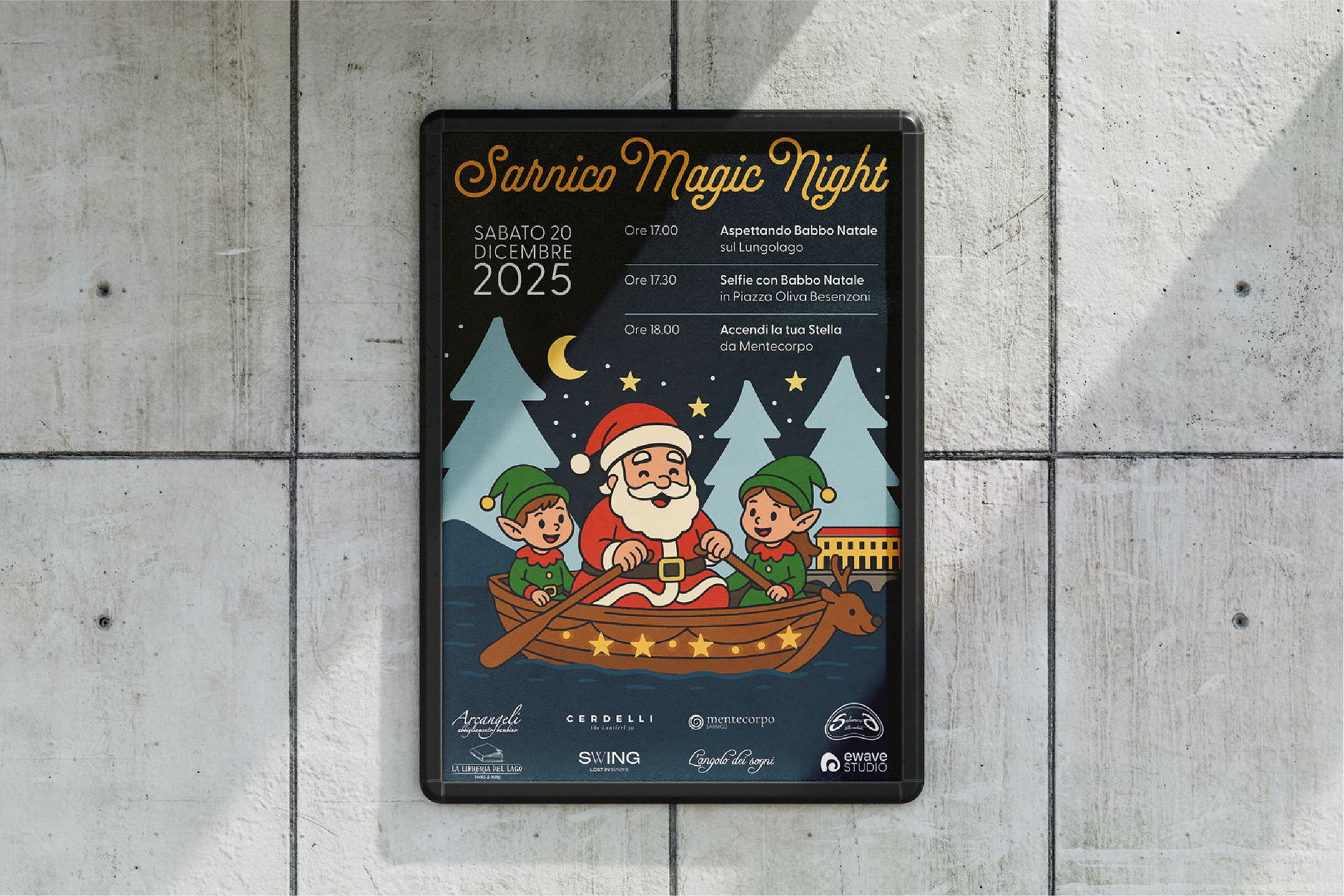 Per Sarnico Magic Night ho realizzato un poster che illustra Babbo Natale e due elfi a bordo di una barca che solca il Lago d’Iseo, immergendoli in un’atmosfera natalizia e fiabesca.